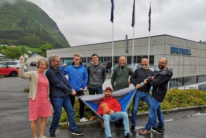 Fire bedrifter fra vintersesongen 2022 får gave av Friluftsrådene, hengekøyer med Stikk UT!-logo. Det er Angvik Grytnes Entreprenør as, NAV Møre og Romsdal, Brunvoll Volda og Sparebanken Møre.