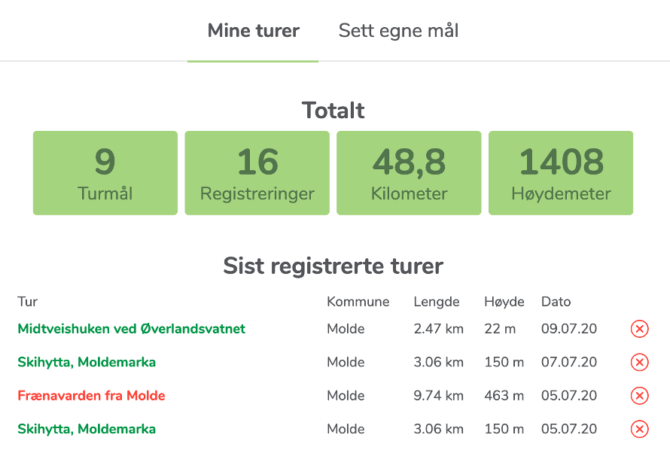 I år har vi videreutviklet Min side med flere funksjoner. I tillegg til to tur-lister finner du også en mulighet til å Sette egne mål for sesongen. Her bestemmer du selv hvor mange turer, turmål, kilometer og høydemeter du ønsker å nå. Les mer om dette her: