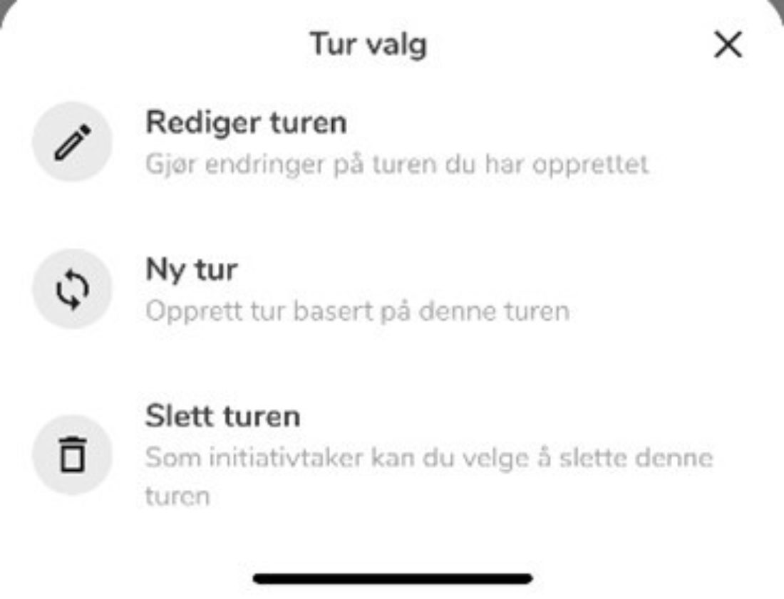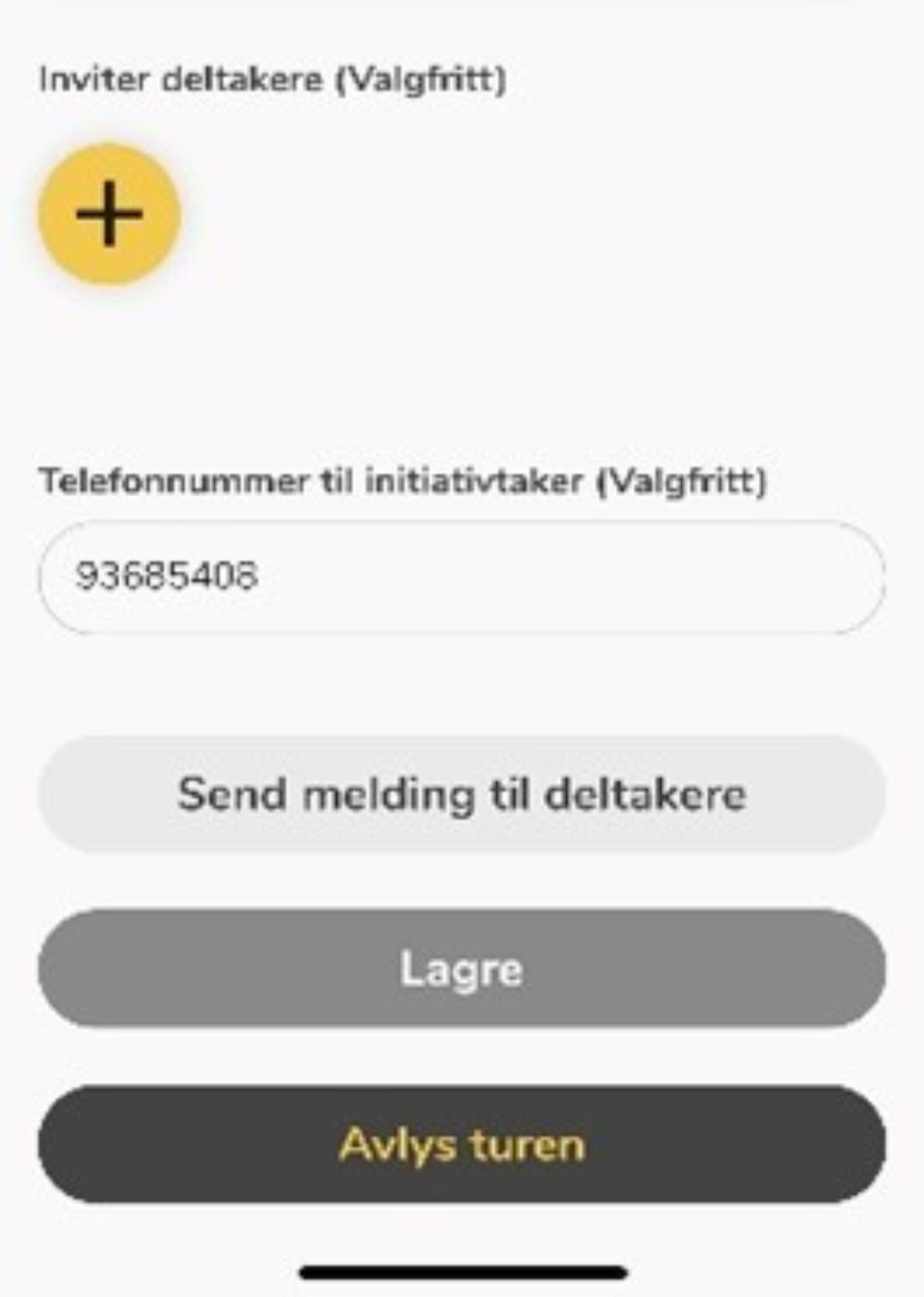 Du har opprettet en tur og kan siden gjøre endringer. Trykk på de tre prikkene øverst til høyre på «turen» og du får opp tre valg «rediger turen», «ny tur» og «slett turen». Trykk på rediger turen og du kan invitere flere deltakere og sende melding til deltakere (ved endringer i turen f.eks.) og avlyse turen.