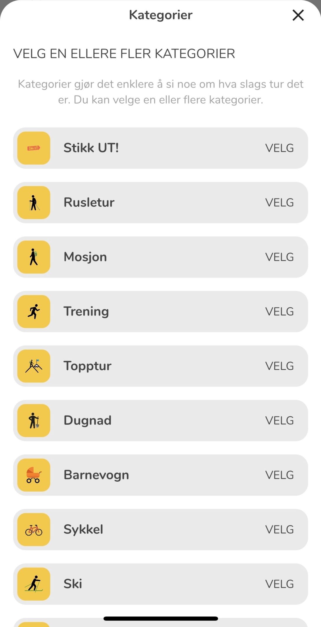 Du kan velge mellom 13 ulike kategorier hvis du ønsker det, det gjør det enklere å si hvilken tur det er. Du kan velge ett illustrasjonsbilde som ligger i appen eller legge inn ditt eget bilde (trykk på kameraet øverst til høyre). Velg om turen skal være synlig for alle eller bare for de du inviterer. Nederst kan du invitere med deg turvenner.