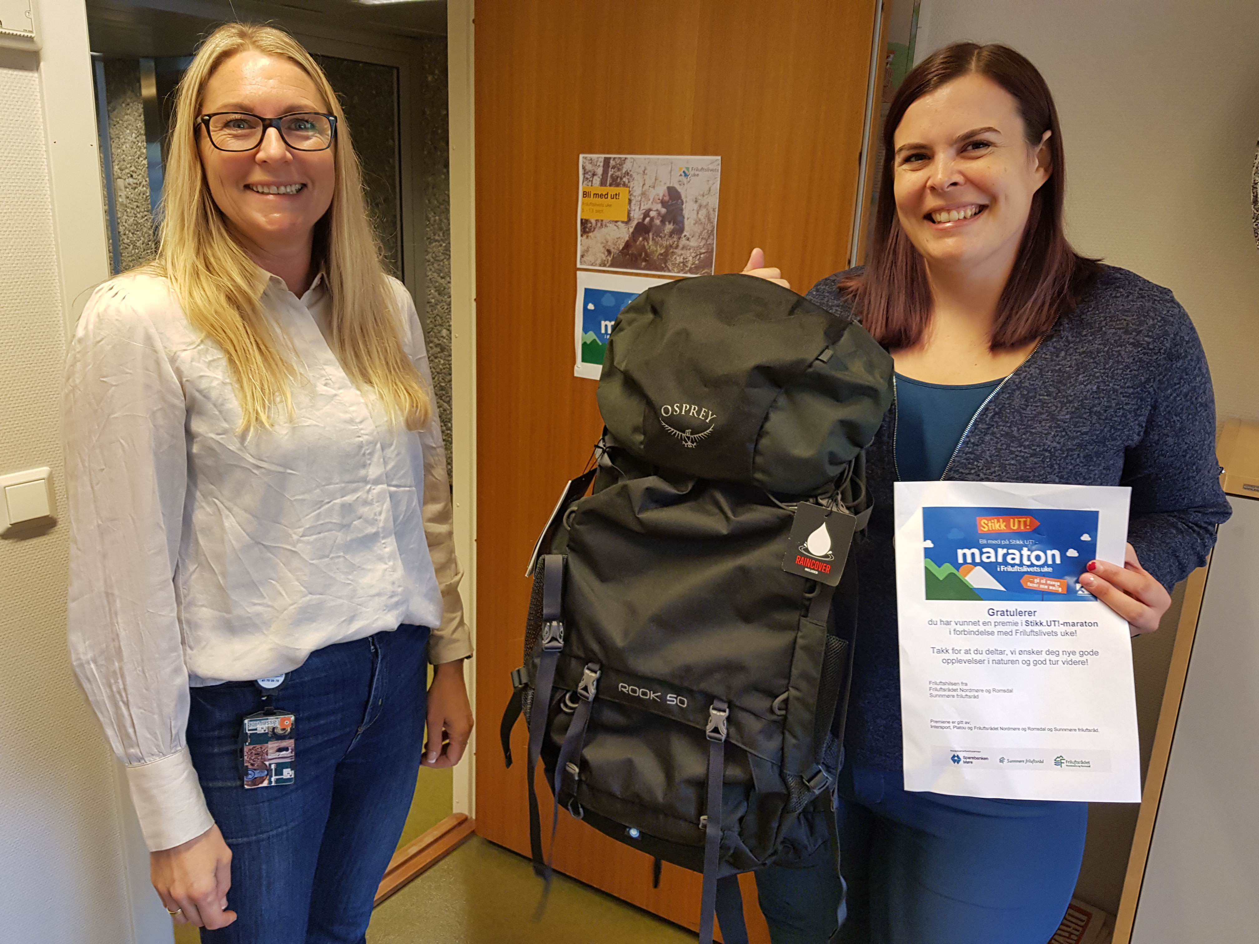 Ane Asprang fra Ålvundeid ble trekt ut som vinner av en fin tursekk fra Platou Sport. Det var turen til Håsøran på Sunndalsøra som ble trekt ut. Premien ble overlevert av Stikk UT!-kontakt i Sunndal kommune, Siv-Grete Sponås.