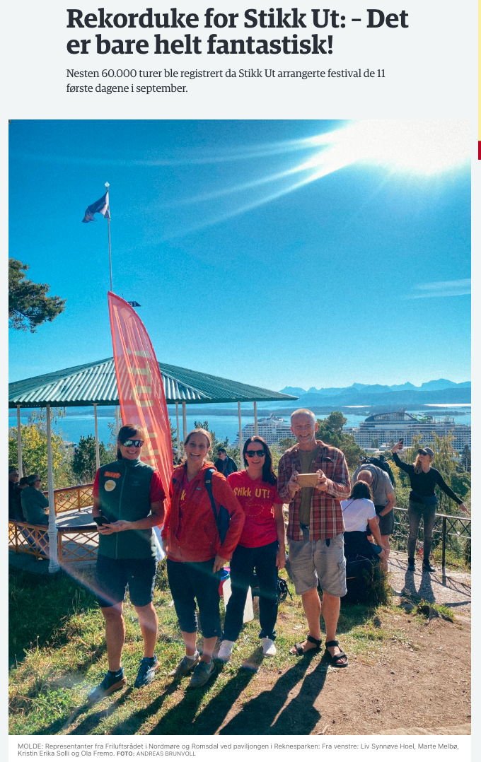 I september hadde vi 11 nydelige dager med sol. Da passet det bra å arrangere tidenes første Stikk UT! Festival! Under festivalen ble det registrert 60 000 turer som er rekordmange registreringer på litt over ei uke. Sammen med hovedsponsor Sparebanken Møre og våre samarbeidspartnere Istad og Wattn arrangerte Friluftsrådene 15 fellesturer for private og bedrifter. - Stikk UT! Festivalen er kommet for å bli slår Anne Berit Støyva Emblem fast.